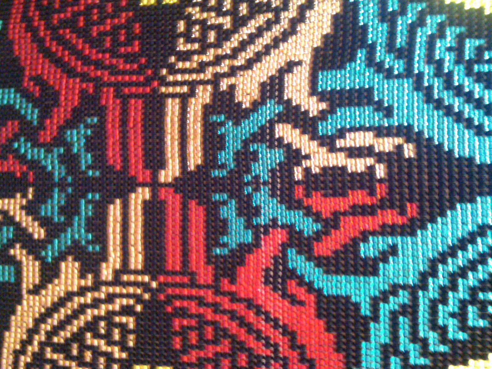 I am posting some pictures at the request of one of the representatives of Myuiki Co., Ltd. in Japan. This is the company that makes the beads I use in my tapestries. For some reason none of the pictures are getting through email. With any luck I will be presenting my pieces for display at Myuiki in Japan for the next showing.